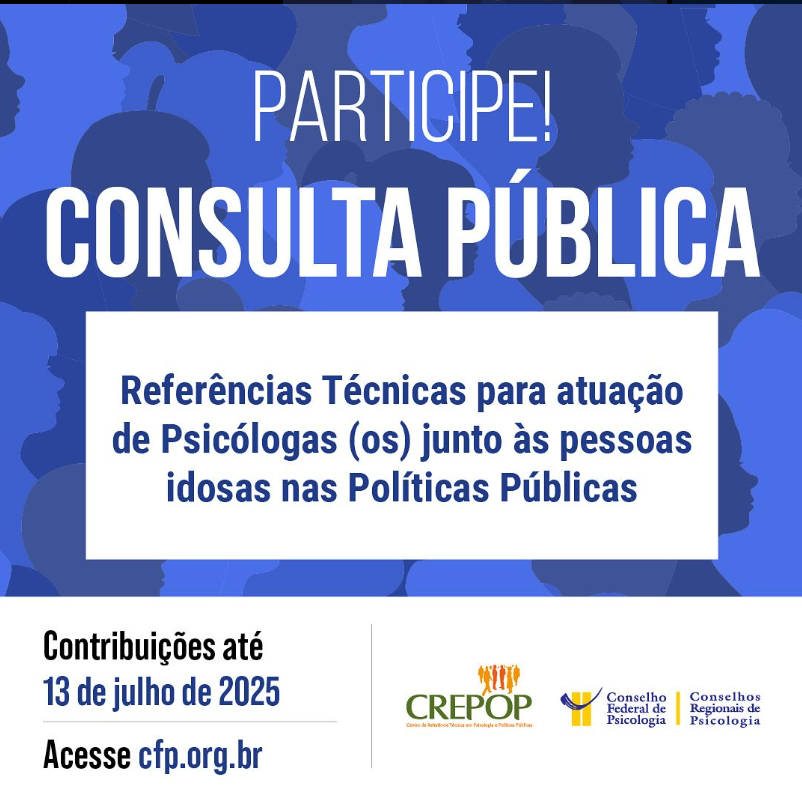 O Conselho Federal de Psicologia (CFP), por meio do Centro de Referências Técnicas em Psicologia e Políticas Públicas (CREPOP), iniciou nesta segunda-feira (9) a consulta pública para que psicólogas e psicólogos de todo o país possam contribuir para a futura publicação que irá abordar a atuação da categoria junto às pessoas idosas no âmbito das políticas públicas.
