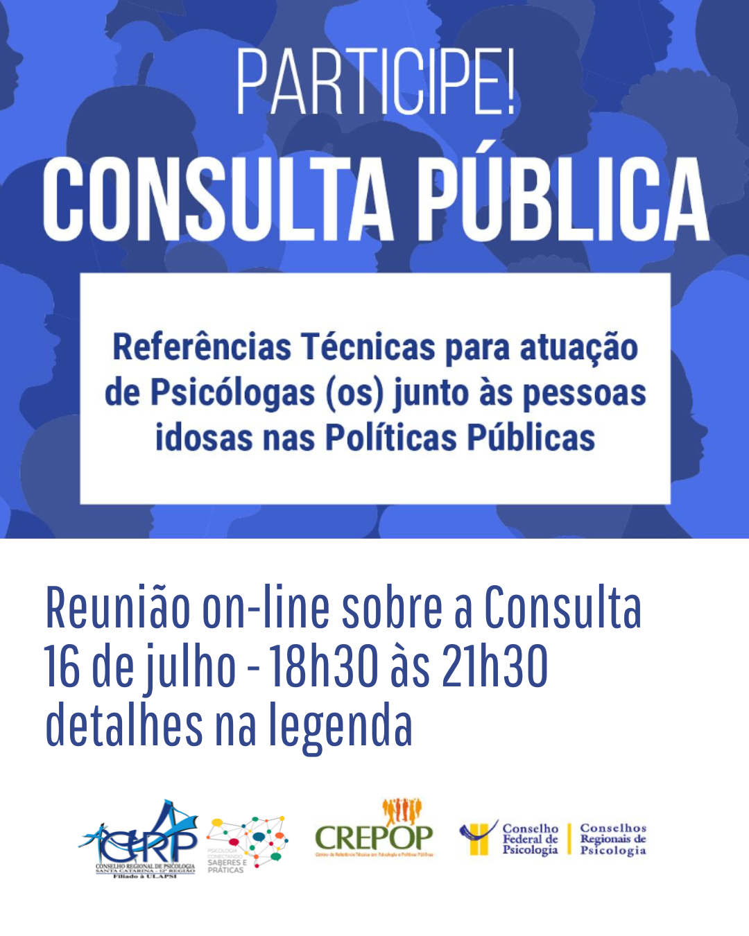 A reunião será realizada no formato on-line, das 18h30 às 21h30. As interessadas devem enviar um e-mail para crepop@crpsc.org.br, informando seu nome e número de CRP até dia 14 de julho.