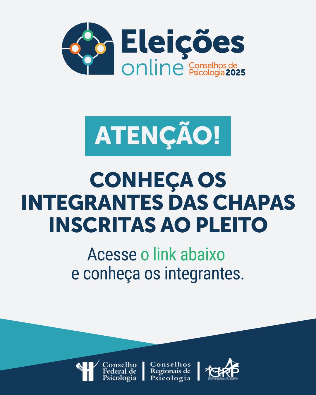 Nesta data, 19 de junho, divulgamos os integrantes das chapas inscritas e homologadas para o pleito que definirá a próxima gestão do Conselho Regional de Psicologia da 12ª Região (CRP-12), correspondente ao triênio 2025-2028.