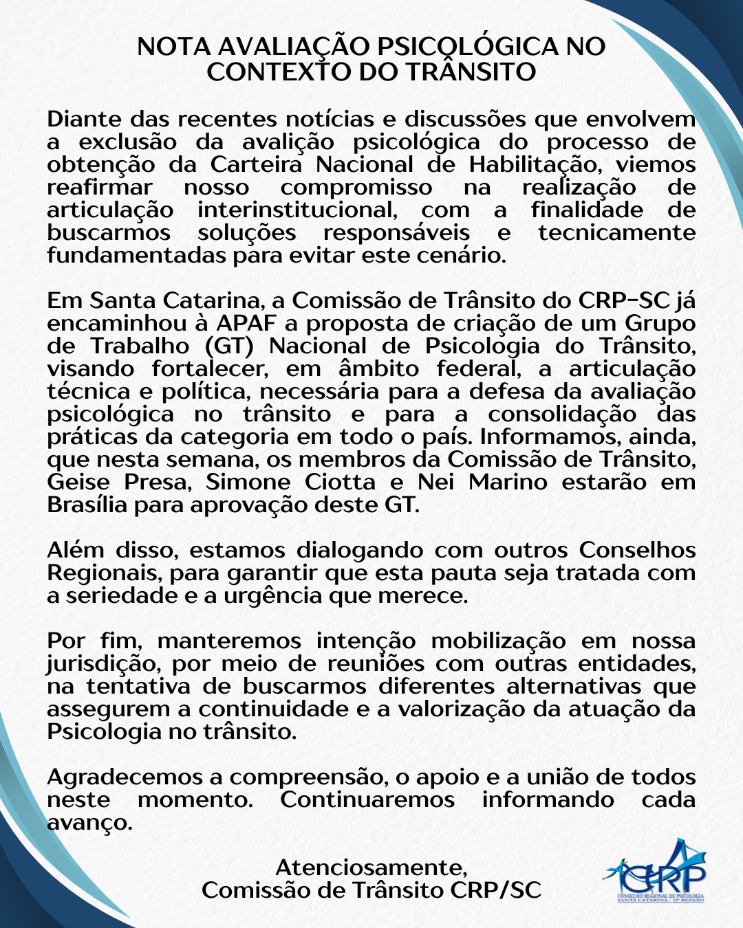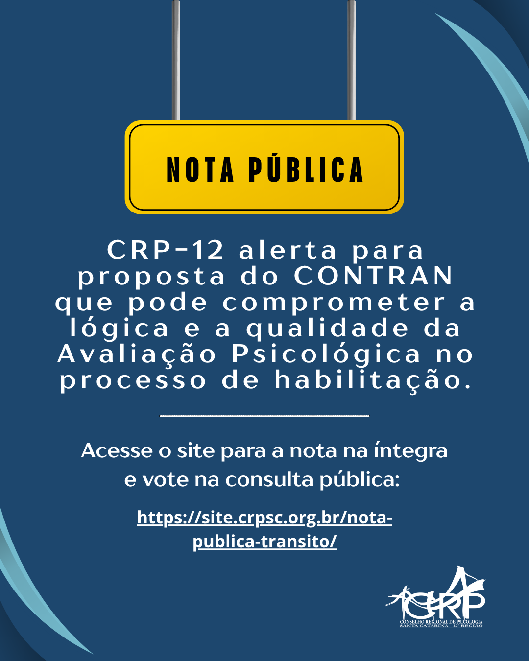 Nota Pública – CRP-12 alerta para proposta do CONTRAN que pode comprometer a lógica e a qualidade da Avaliação Psicológica no processo de habilitação